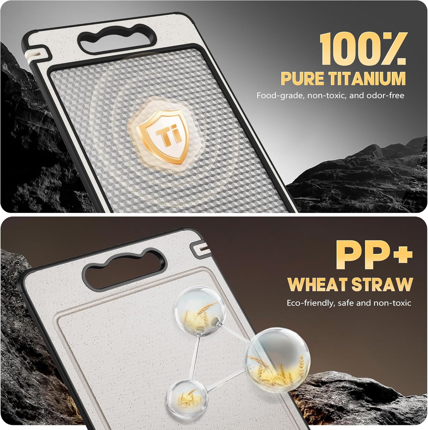 • Healthy Double Sided Cutting Board:Built with food-grade titanium on one side and eco-friendly BPA-free wheat straw fiber on the other, this board ensures hygienic food prep. The titanium side is perfect for cutting meat, offering durability and resistance to stains and odors, while the wheat straw side handles fruits and vegetables, maintaining ingredient purity and preventing flavor crossover.